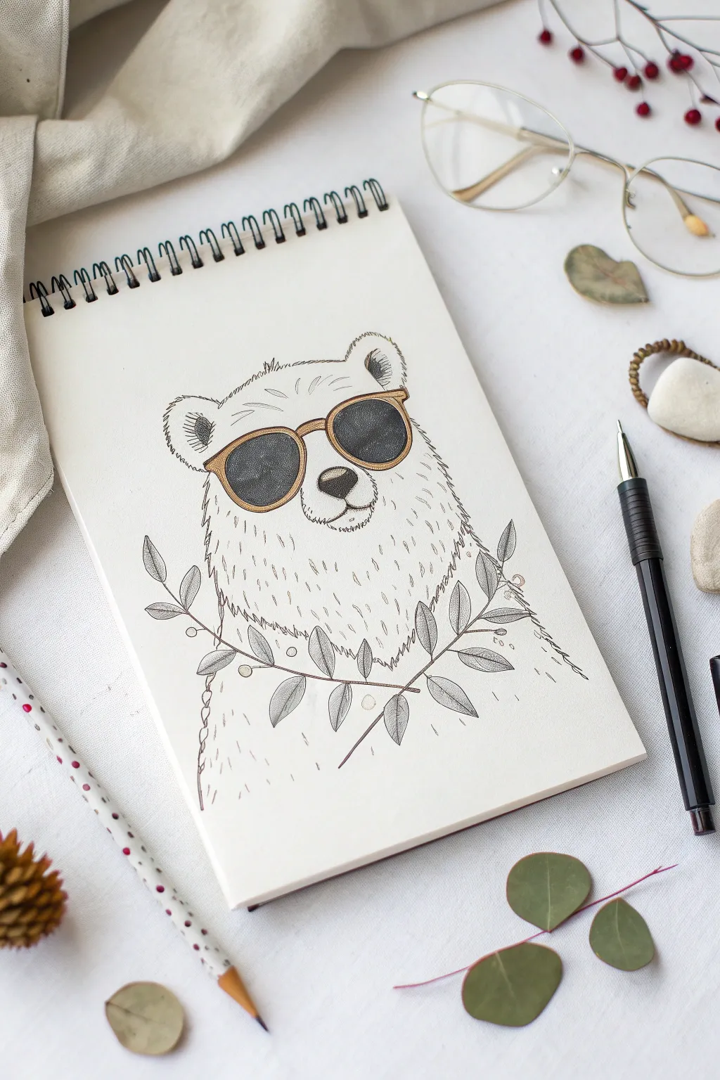 Draw a bear sporting a pair of quirky glasses. This playful detail adds character and charm to any sketchbook page.