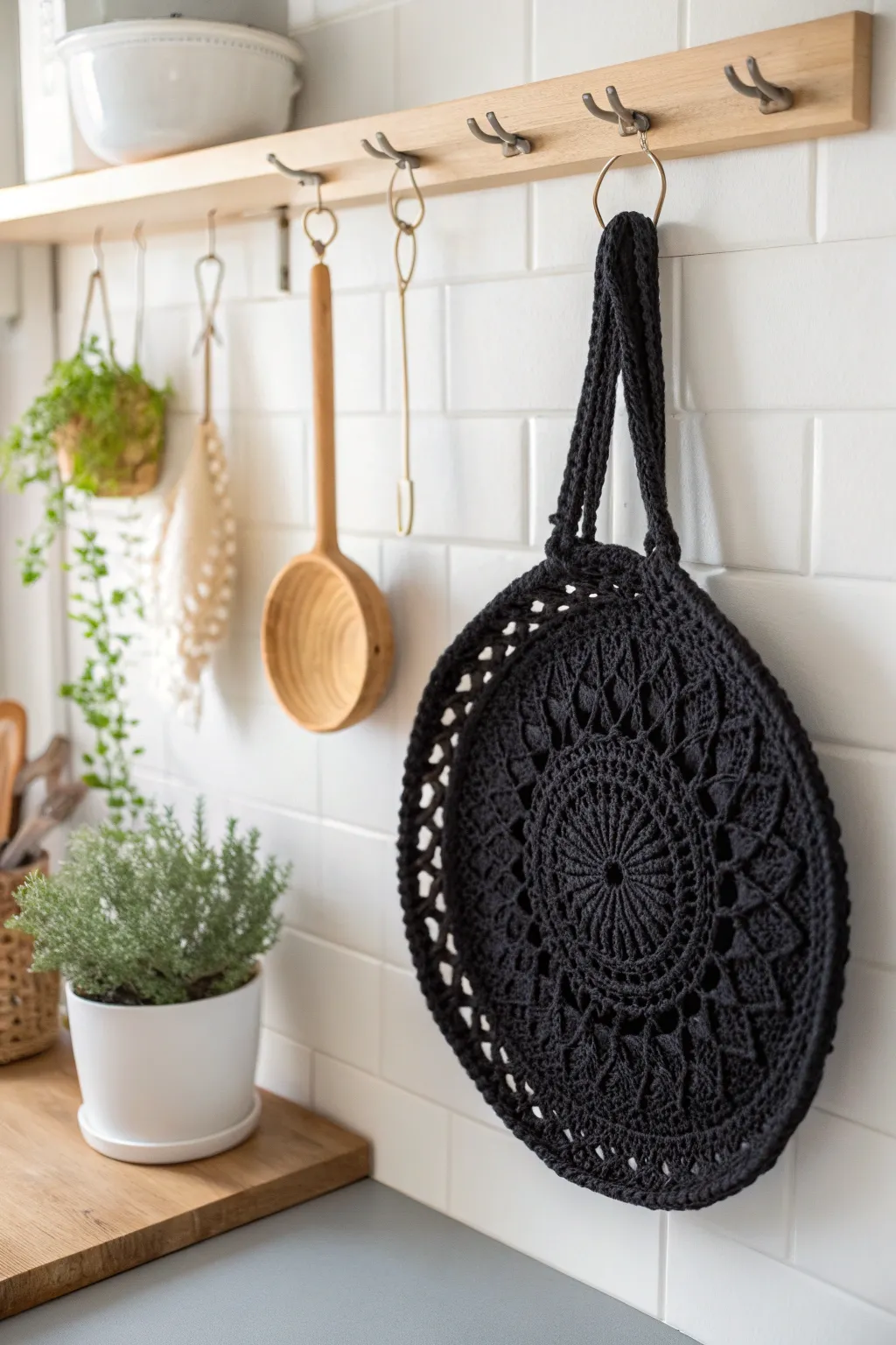 Elevate your kitchen's elegance with handcrafted black crochet pot holders.