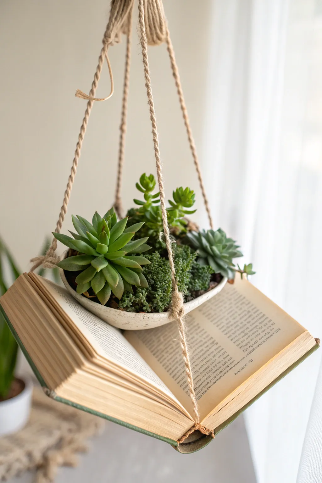 Merge your love for books and greenery with a hanging book planter. I used an old hardcover, and now it’s a beautiful home for my succulents. It’s a quirky and delightful way to upcycle!
