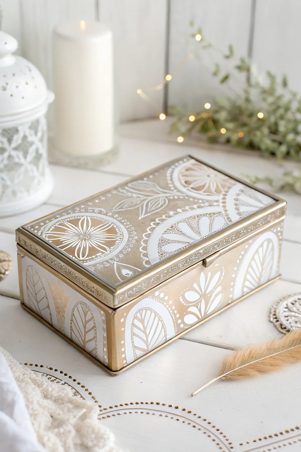 Use stencils to paint intricate designs on your box. This technique is great for adding detailed artwork without the need for expert freehand skills.