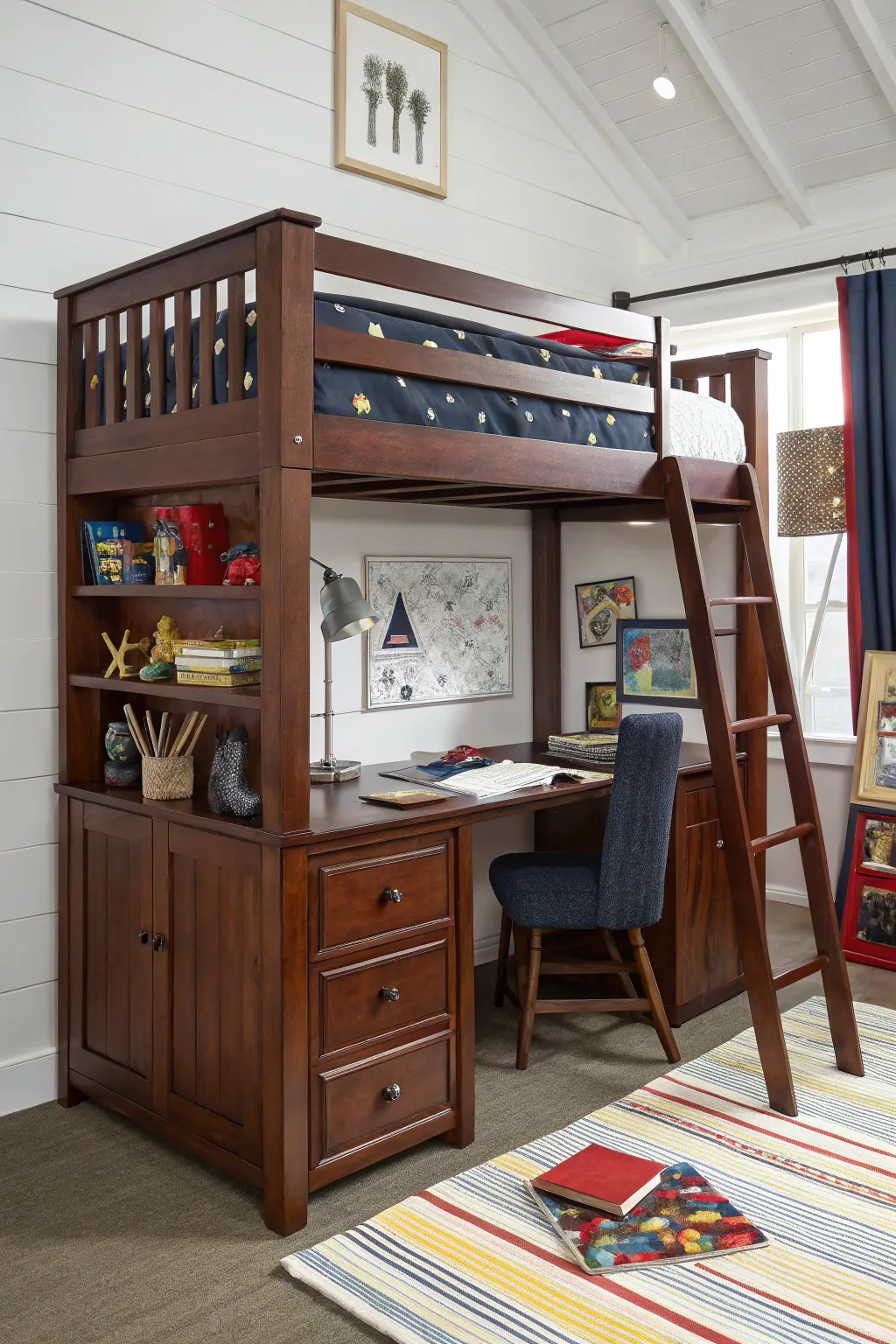 Incorporate a desk beneath the bed for a neat study space. In my home, this setup keeps schoolwork separate from playtime, providing a focused area for creativity.