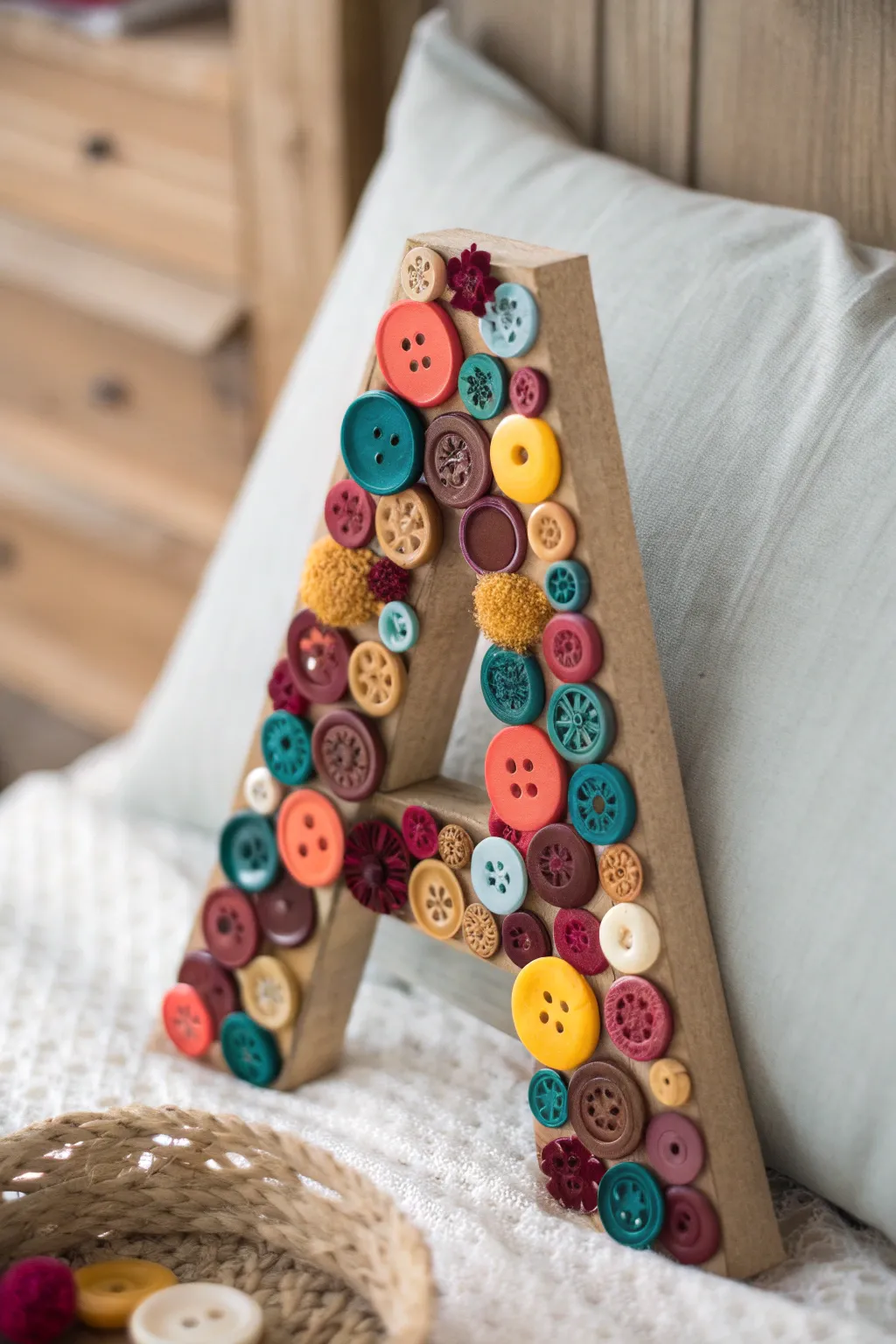 Decorate your cardboard letters with a variety of colorful buttons for a playful, eclectic look. This idea is a favorite for children’s rooms and craft spaces.