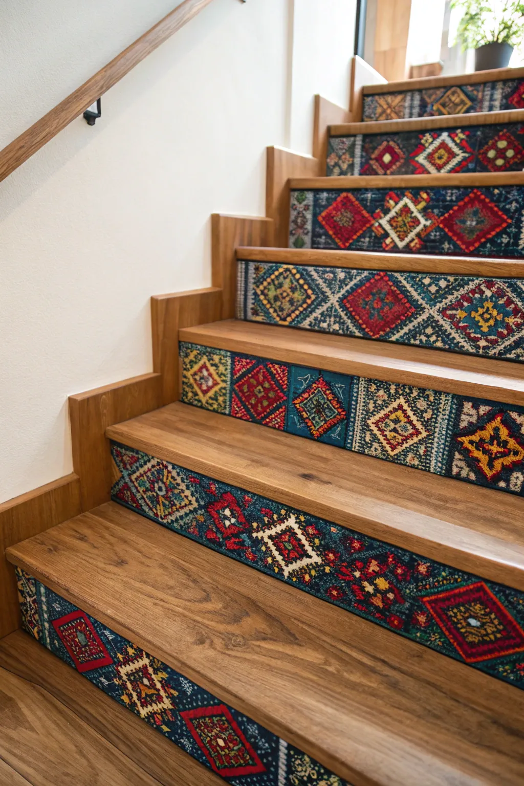 • Colorful Patterned Fabric Tape: Add vibrant patterns to your stairs easily. Change them with the seasons for fresh decor.
