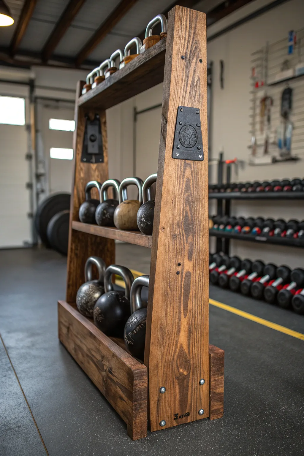 Elevate your garage gym with this DIY kettlebell rack, merging craftsmanship with practicality.