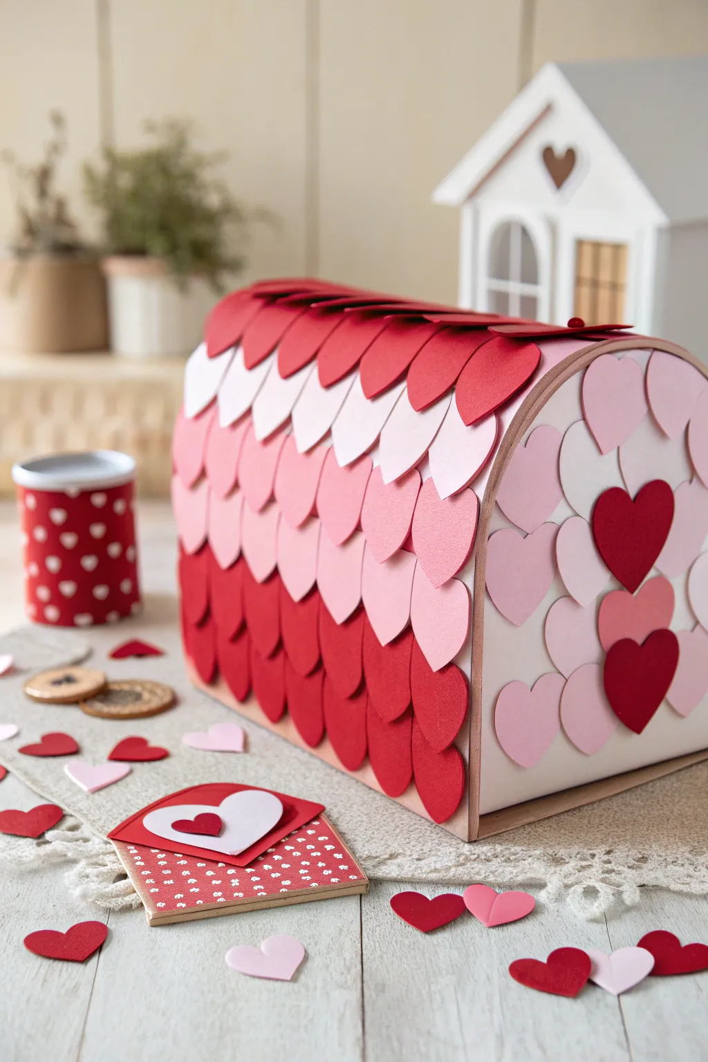 Transform a simple shoe box into a classic heart-themed mailbox using red and pink construction paper. I’ve always loved layering different sizes of paper hearts to add depth and dimension.