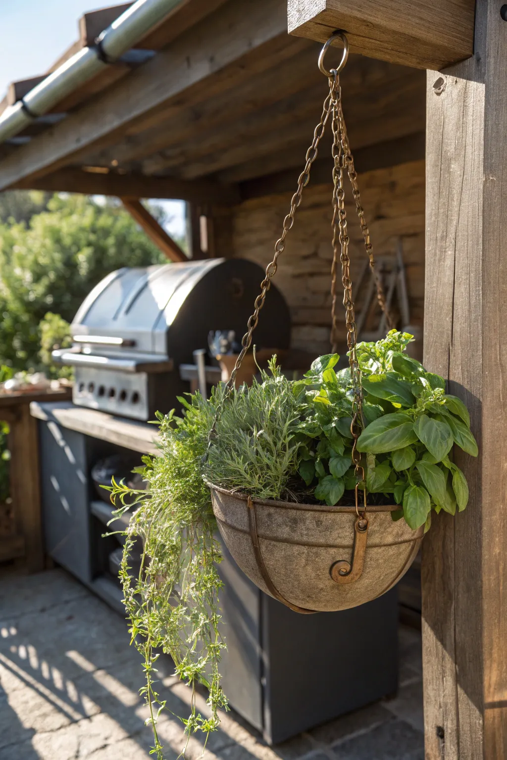 Hang planters with fresh herbs for easy access while cooking. I adore the aroma it adds to my BBQ area, plus it’s practical too!