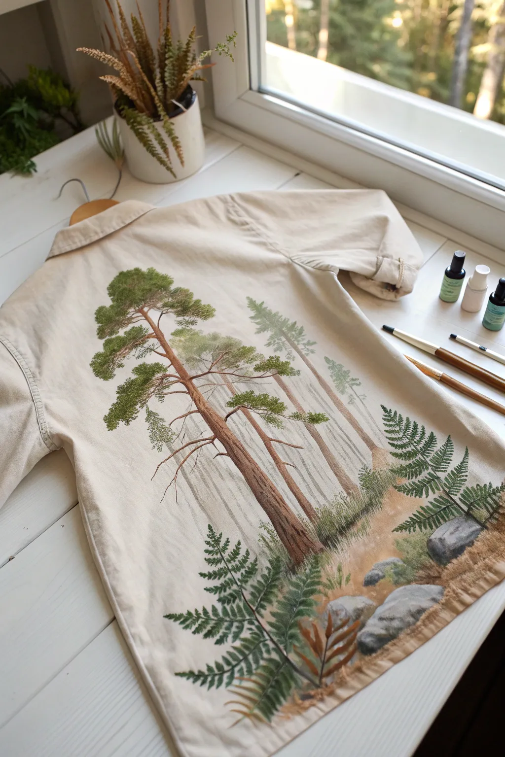 Paint detailed nature scenes directly onto the fabric. This technique allows endless creativity and each shirt becomes a unique piece of art.