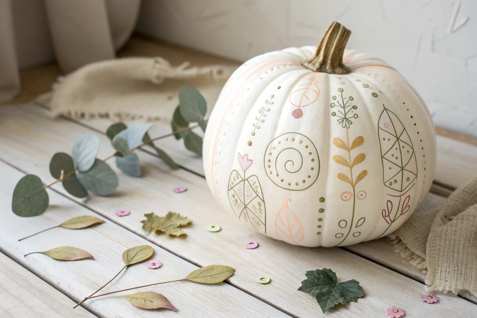 Embrace the essence of fall with nature-inspired doodles on a minimalist pumpkin canvas.