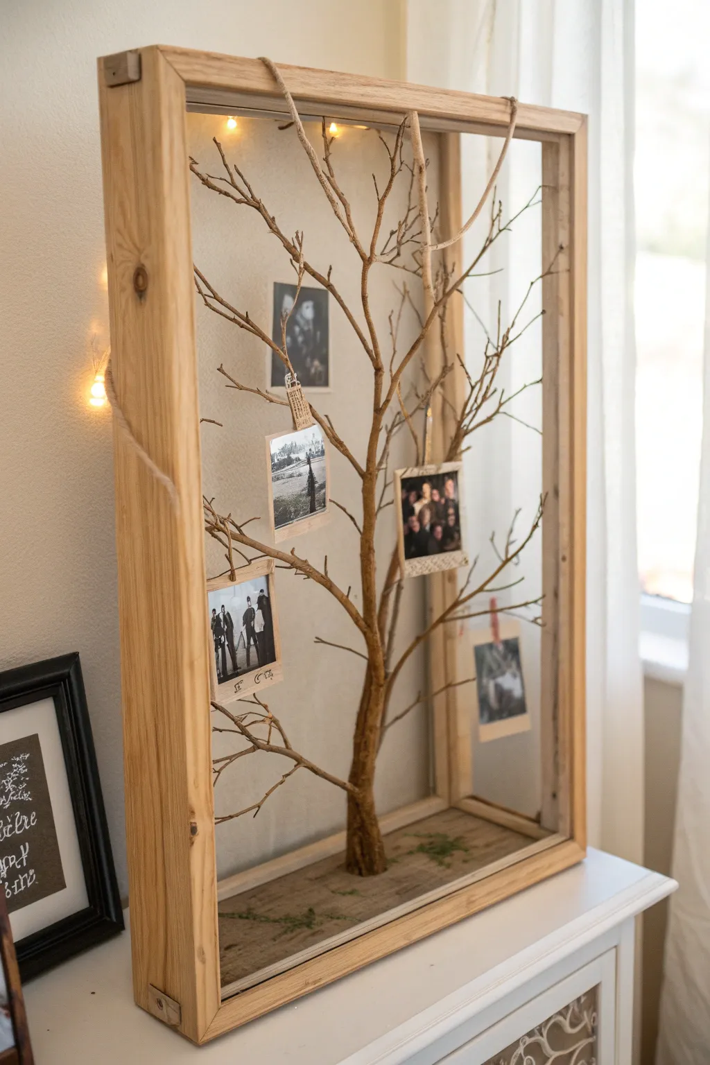Use a shadow box to create a three-dimensional family tree with branches and small photos. This approach protects your display from dust and adds depth to your decor.