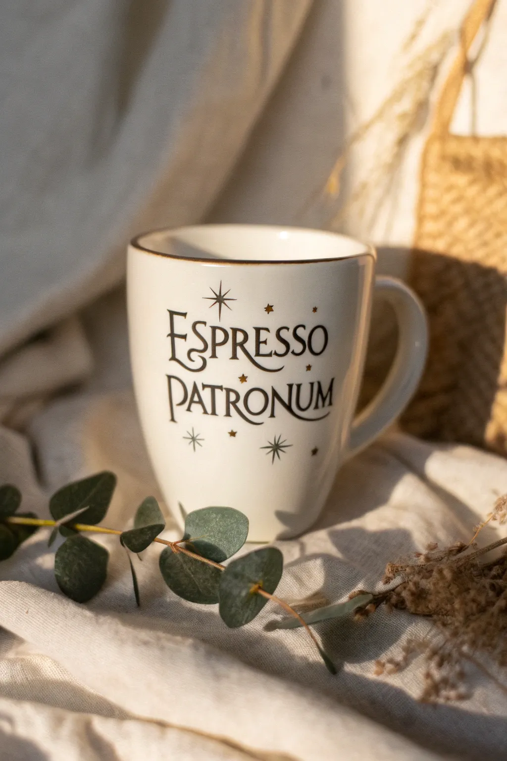 A witty pun like ‘Espresso Patronum’ combines magic with morning rituals. As a DIY enthusiast, I appreciate the clever wordplay every time I take a sip.