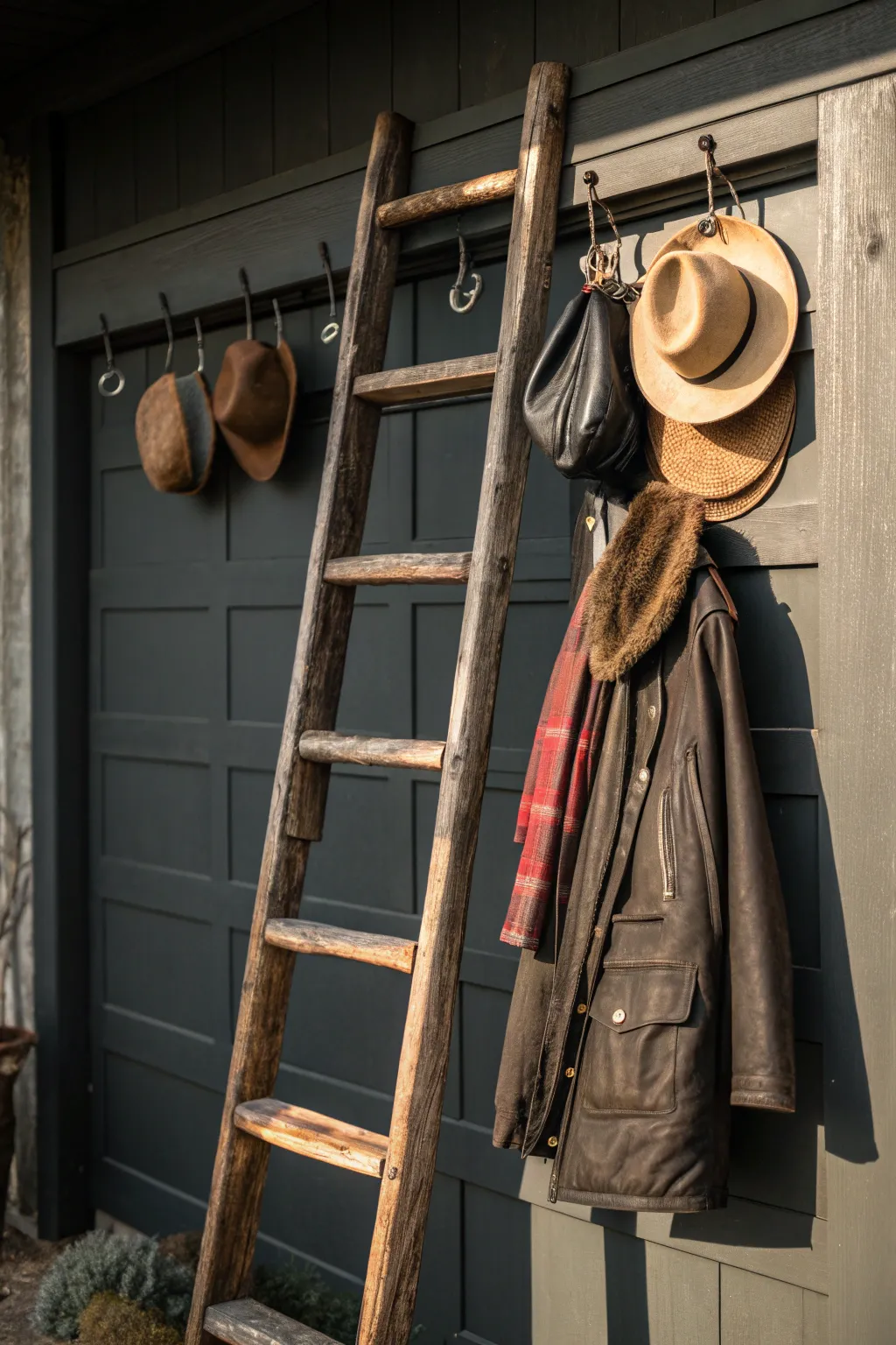 An old wooden ladder can be mounted horizontally on the wall to serve as a creative coat and hat rack. I’ve done this with a vintage ladder, and it’s always a conversation starter.