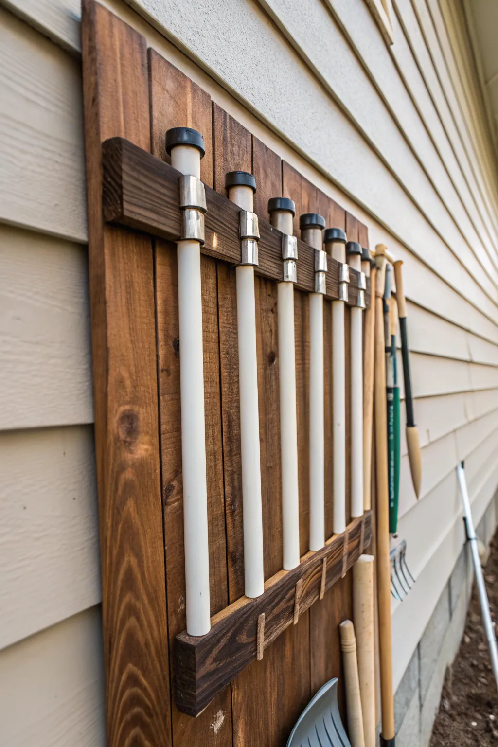 Cut PVC pipes into shorter sections to create vertical holders for long-handled tools. I attached these to a wooden backing and it’s been a game-changer for my garden tools.