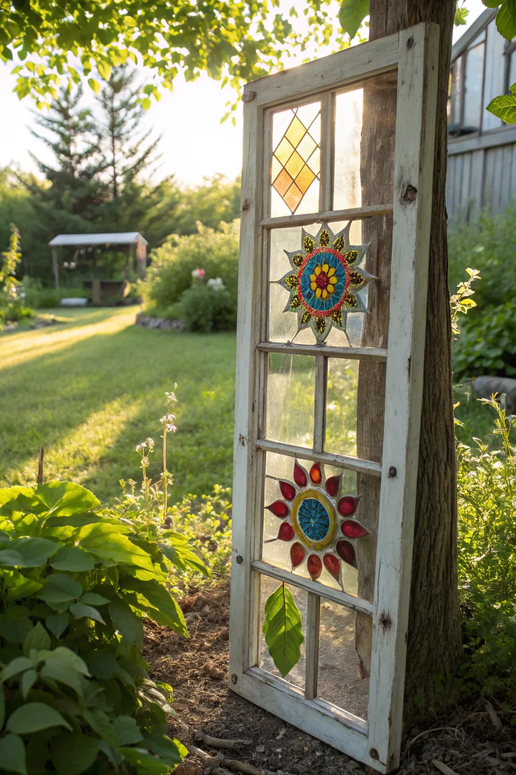 Transform your garden with a touch of colorful elegance using repurposed framed glass art.
