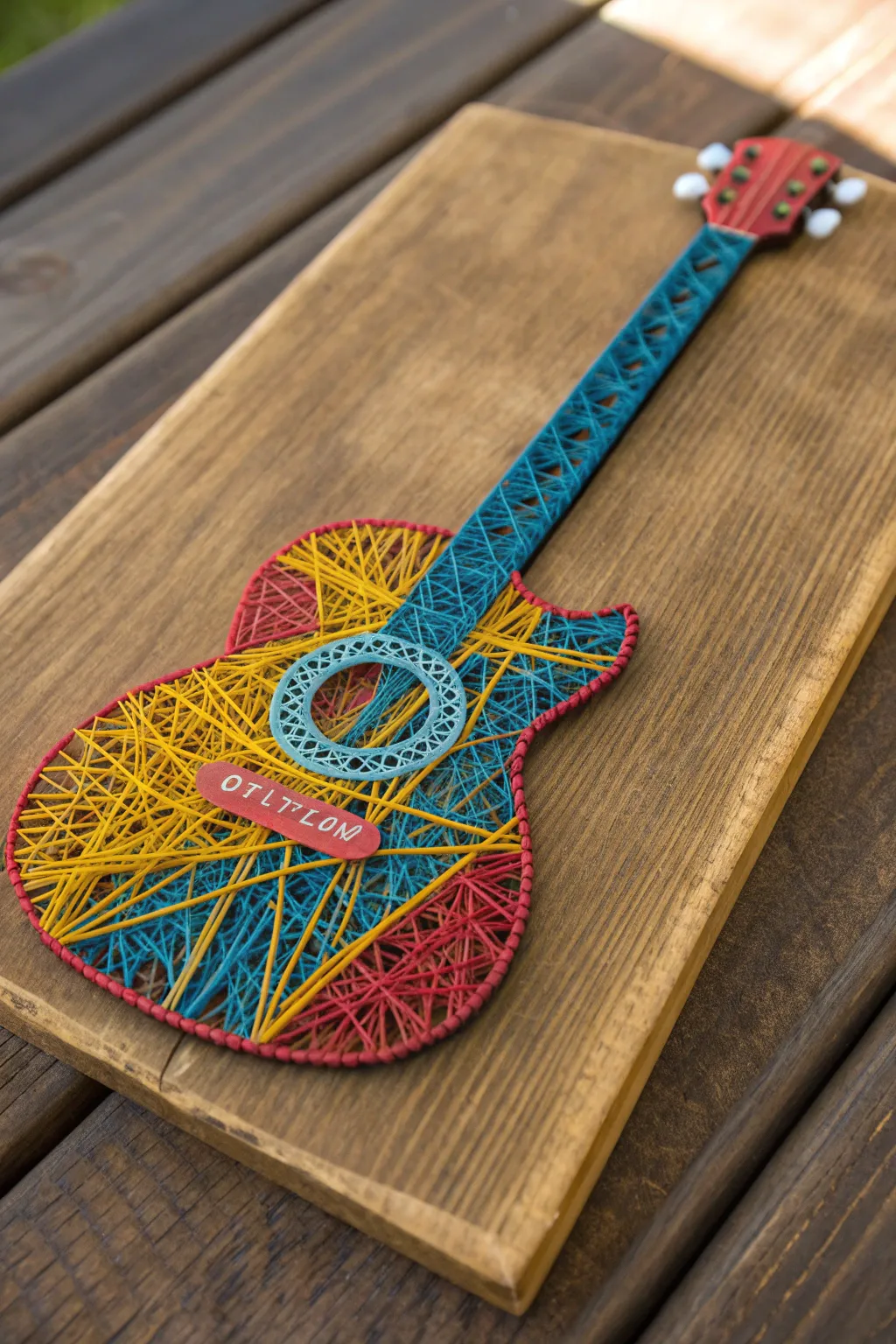 Create a beautiful string art guitar on a wooden board. Choose vibrant threads to add a pop of color to any room.