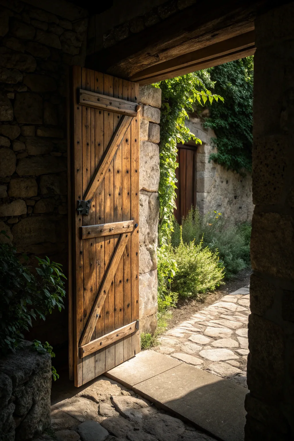 A rustic barn door that blends with the walls adds charm and intrigue. Mine leads to a secret garden, a serene escape from daily life.