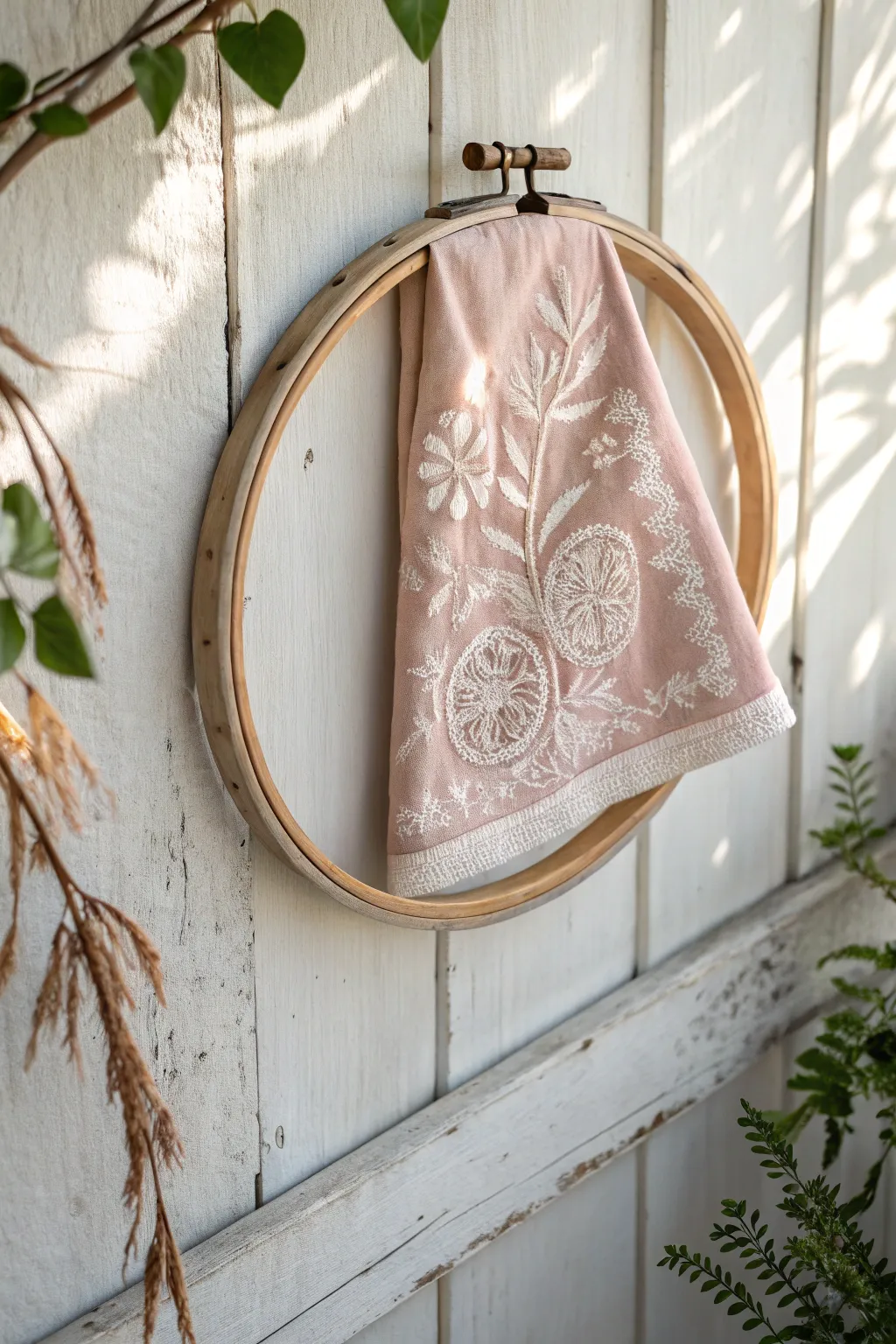 Use embroidery hoops as frames for displaying fabric art or photos. They add a touch of vintage charm and are wonderfully versatile.