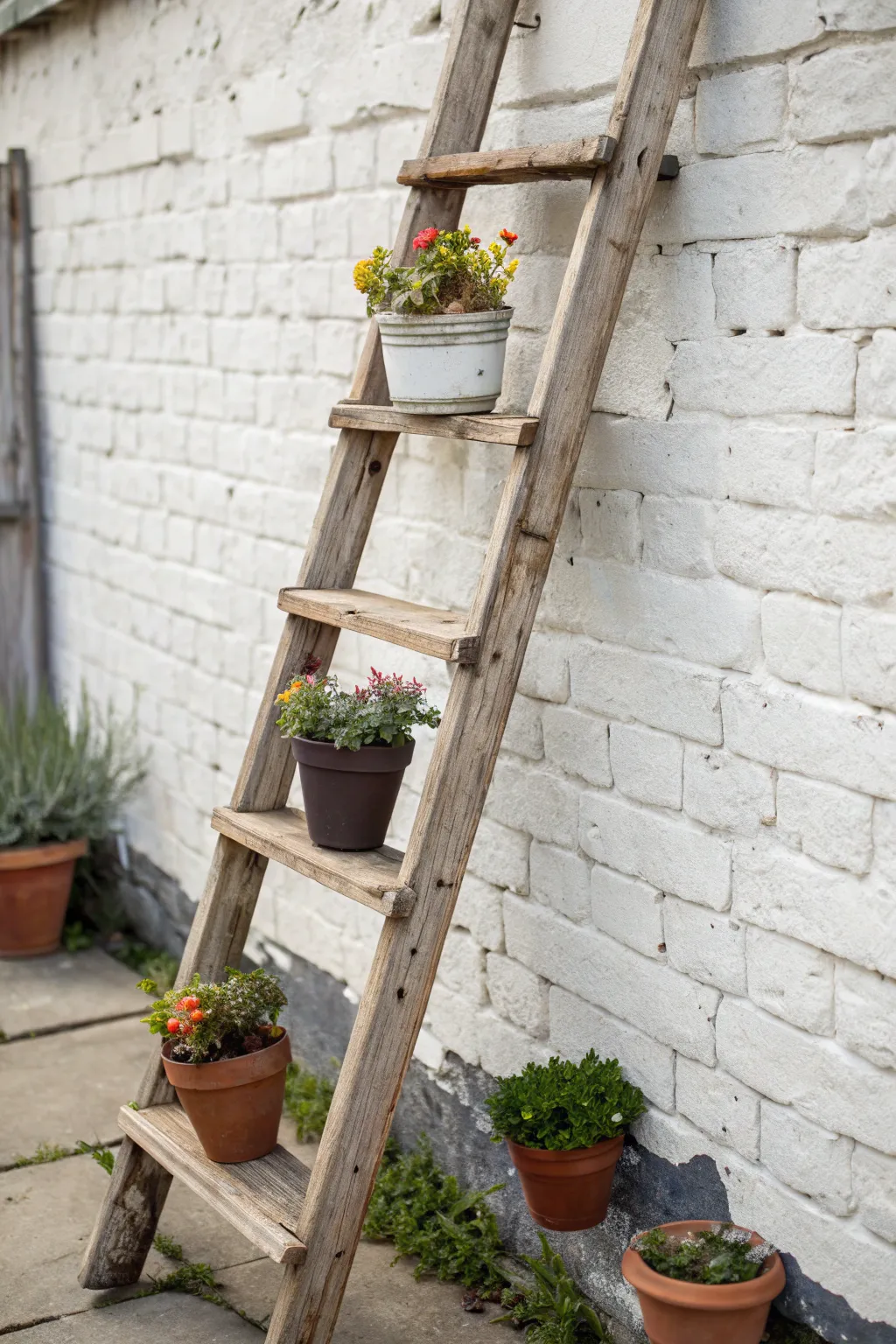 A rickety old ladder makes a perfect plant display. Simply lean it against a wall and use the rungs to showcase potted plants, creating a vertical garden with height and depth.