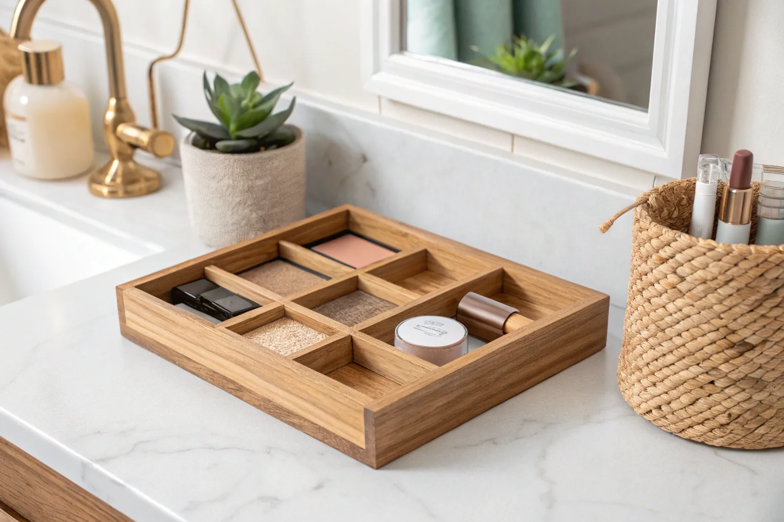 - Wooden Makeup Organizer with Compartments: Optimize your drawer space with a wooden organizer featuring versatile compartments for beauty essentials.