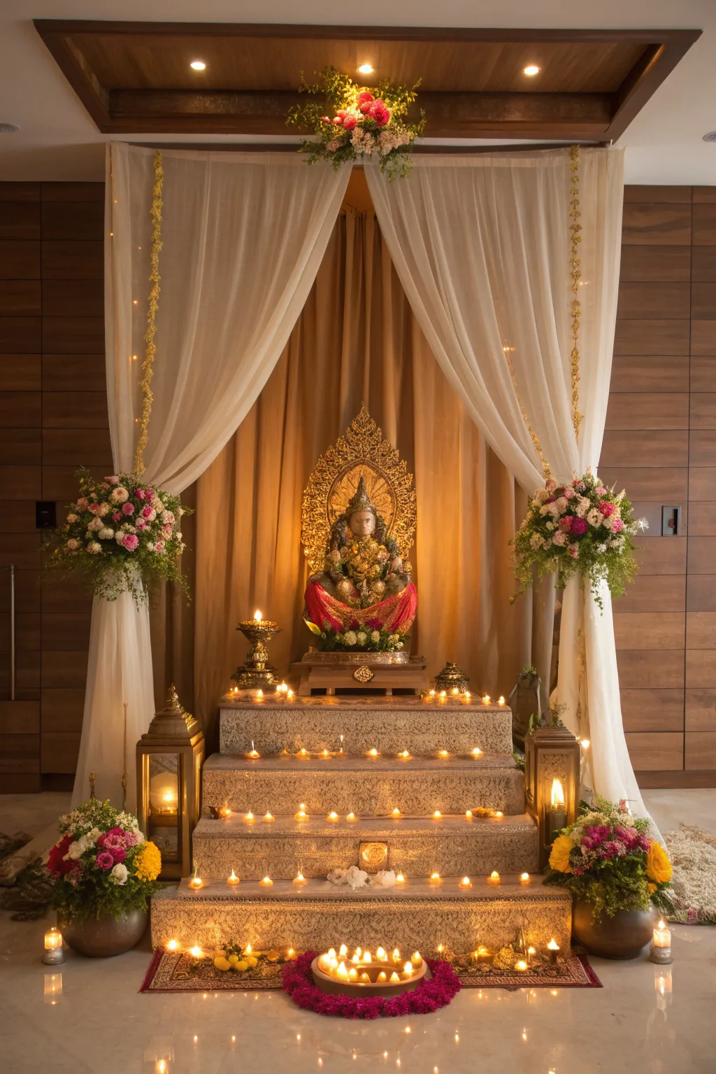 Add a touch of elegance with fabric drapes as a backdrop. In my mandir, soft fabrics add a layer of depth and richness.
