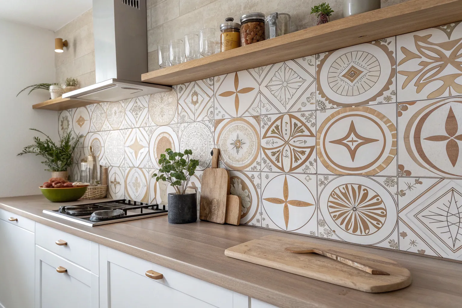 - Rustic Patterned Backsplash Tiles: Transform your space with rustic patterned tiles that evoke charming countryside elegance.