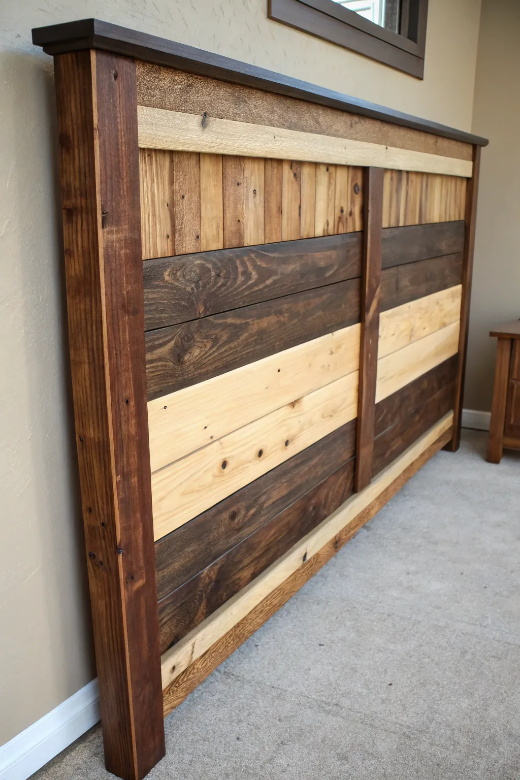 Elevate your bedroom with the timeless charm of a two-tone stained pallet headboard.