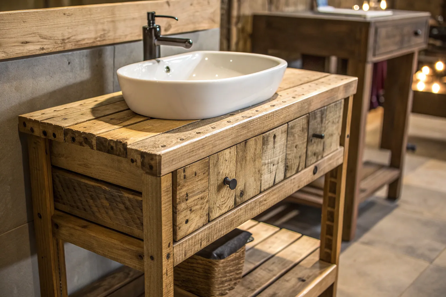 Elevate your space with a handcrafted pallet sink, where raw wood meets industrial elegance.