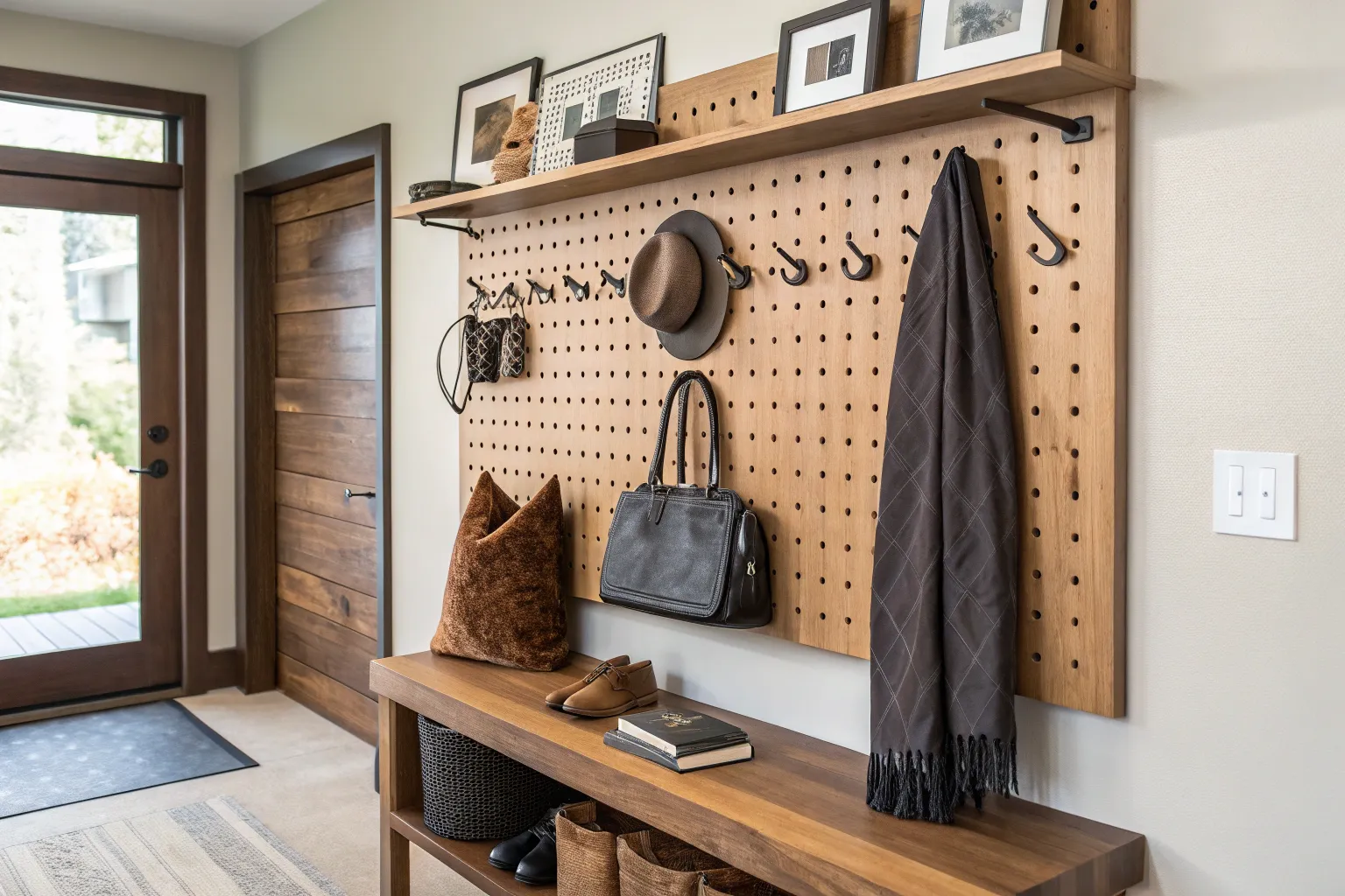 Use your pegboard to integrate seating and storage, creating a multi-functional entryway. This setup has been a game-changer for my compact space.