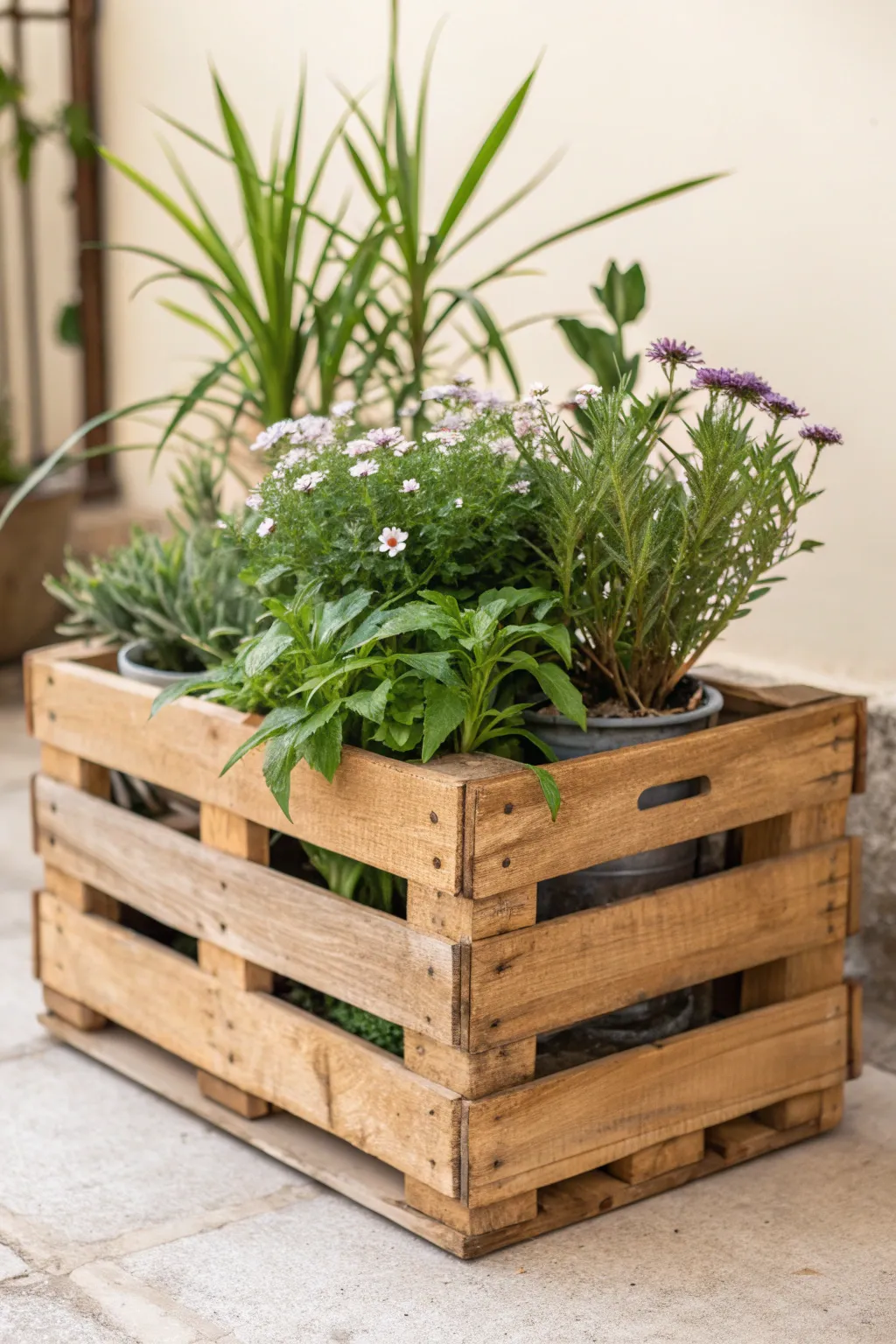 Transform vintage wine crates into charming planter boxes for a touch of natural elegance in your garden.