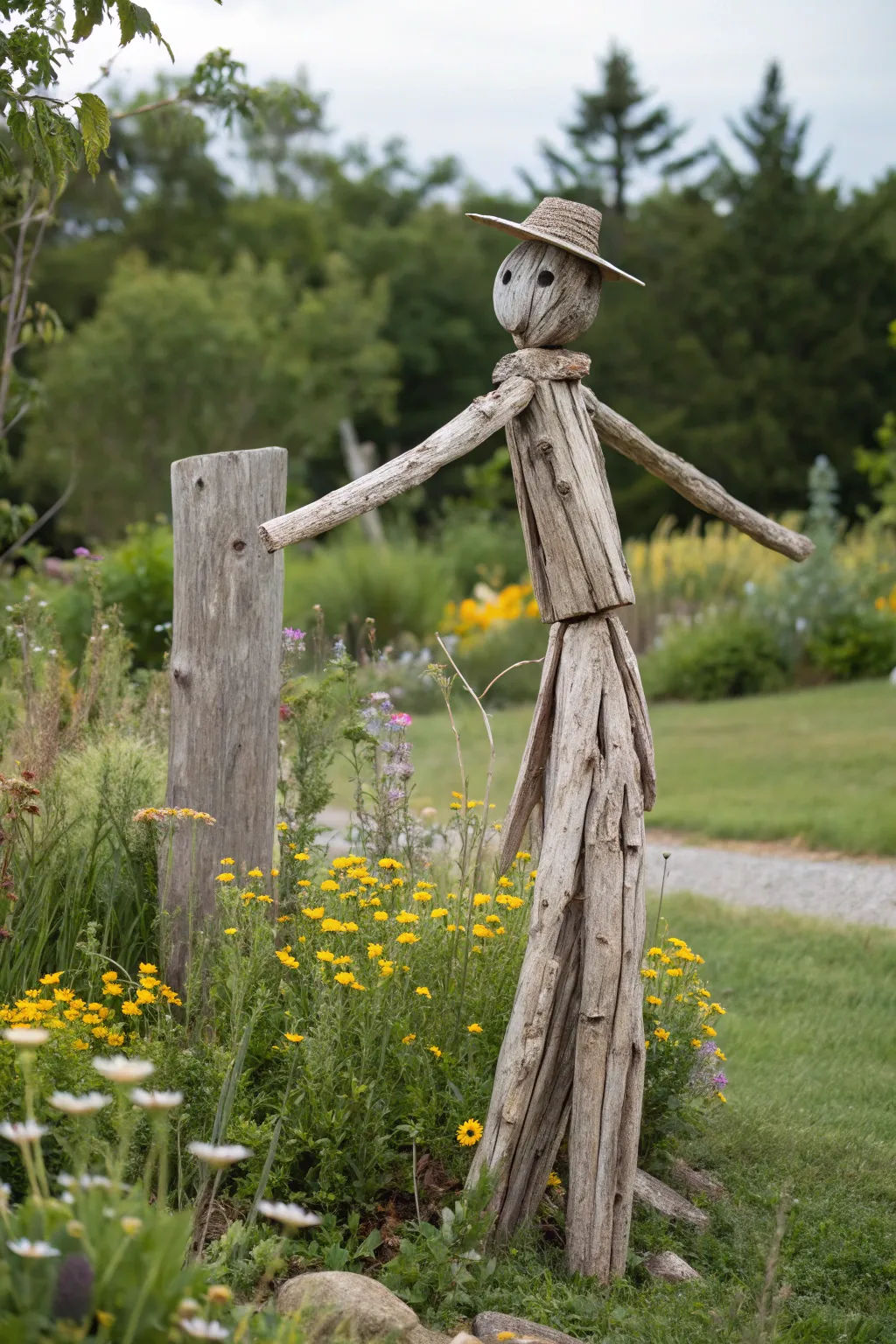 Embrace rustic elegance with a driftwood scarecrow, bringing natural artistry to your garden.