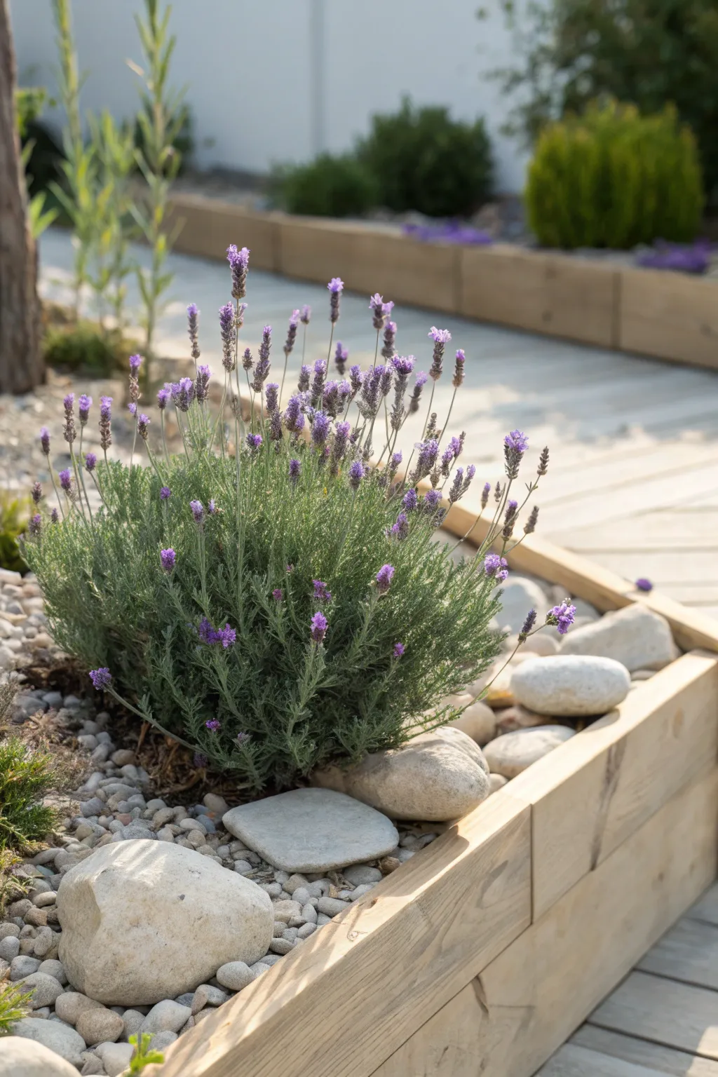 Combine rocks and shrubs for a rugged, natural look. This setup is perfect for sloped areas or dry climates.