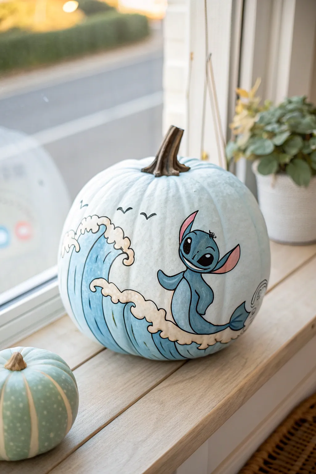Add a surfing element to your pumpkin, with waves painted around Stitch. I tried this for a beach-themed party, and it was a total hit!