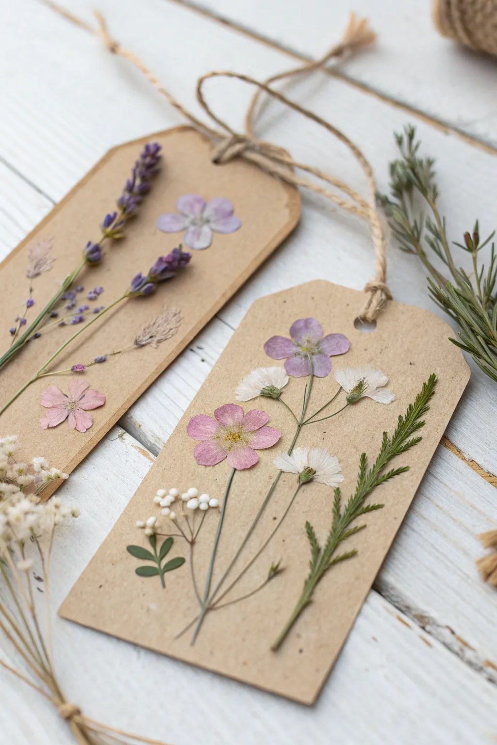 Capture nature’s beauty with tags adorned with pressed flowers. These delicate accents remind me of my childhood pressed flower book.