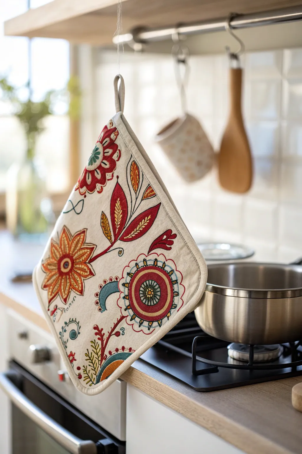 In the kitchen, pot holders can be both functional and decorative. Designing them with family recipes or fun graphics adds a personal touch.