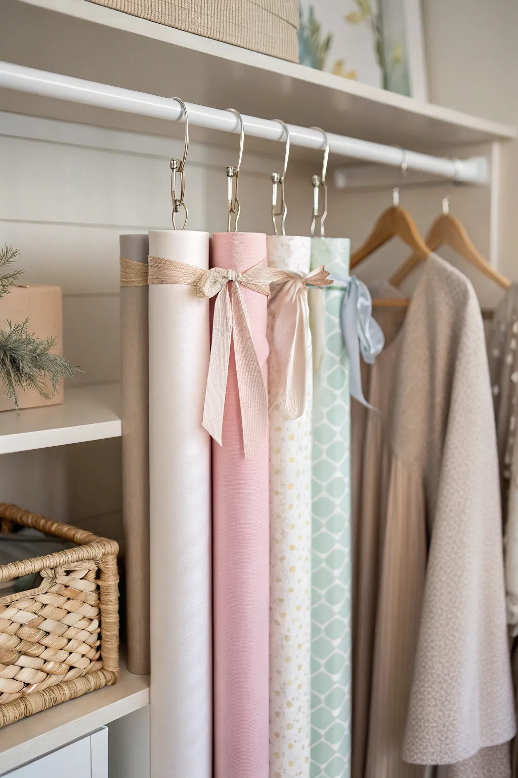 Use tension rods in a closet to display wrapping paper and ribbons. This method not only keeps them organized but also makes your gift-wrapping process more efficient.