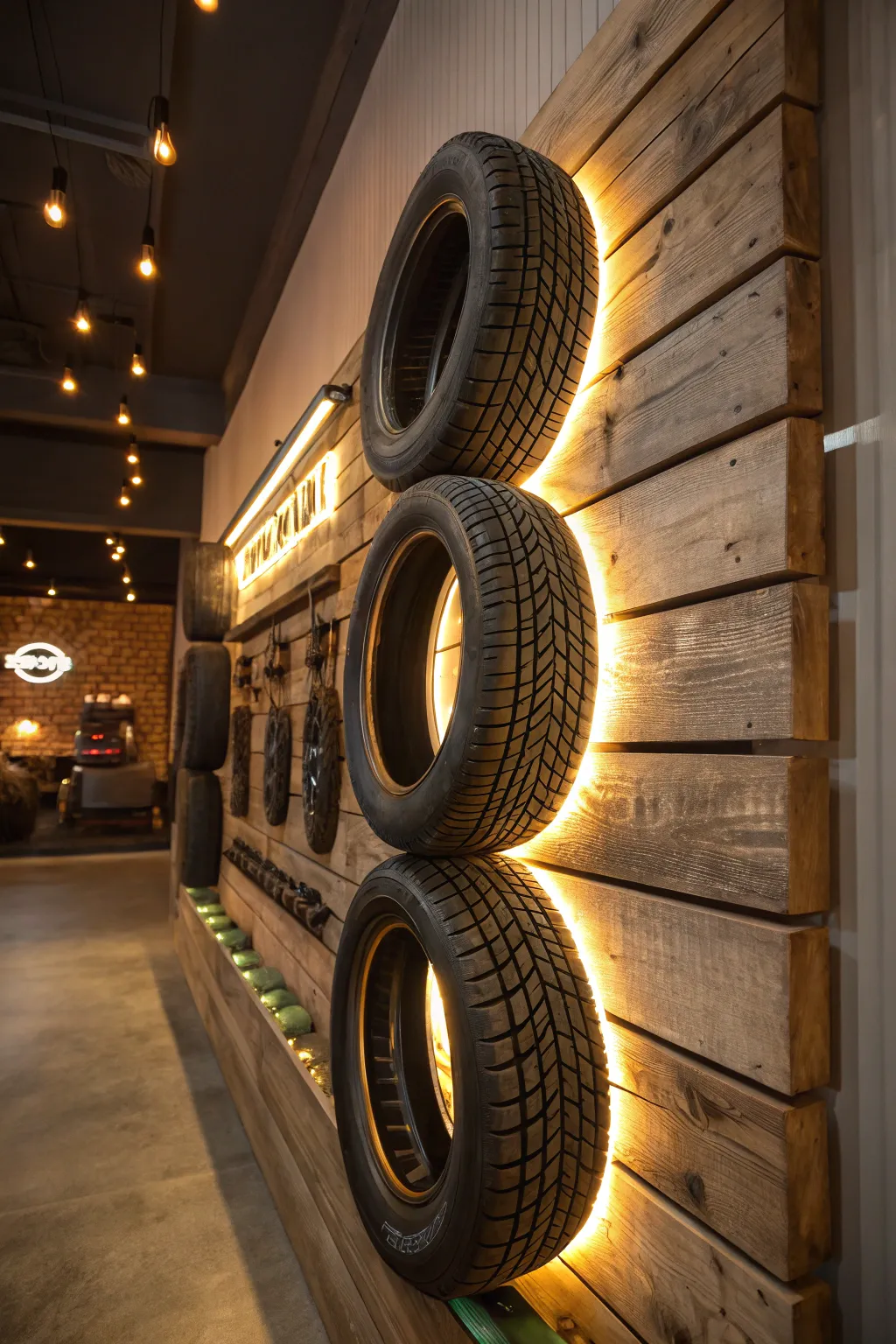 Transform your space with a stunning illuminated tire wall, where craftsmanship meets ambient elegance.