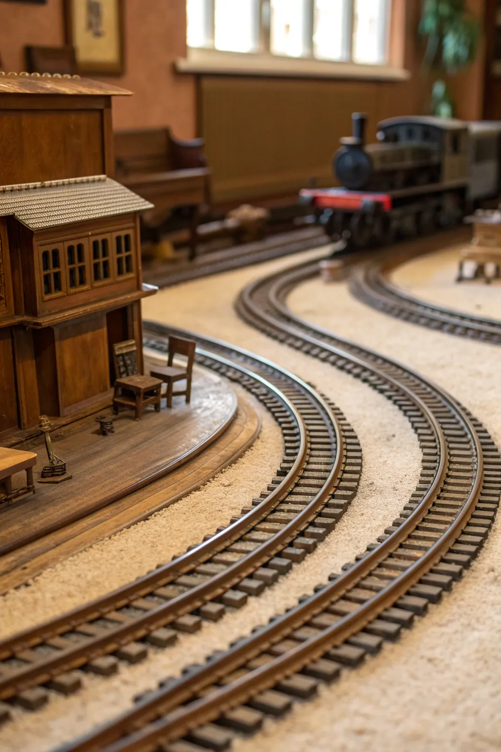 Introduce elevation changes with bridges and ramps to add dimension to your track layout. I find that a bridge over a small indoor plant creates a delightful miniature landscape.