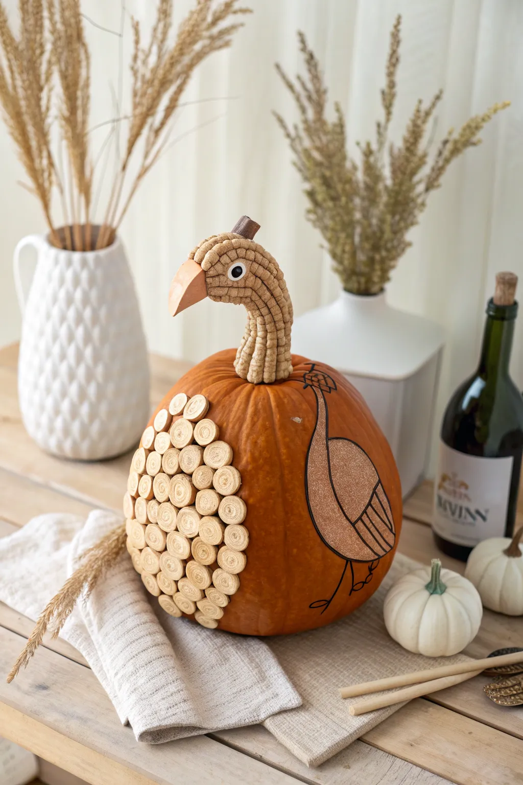 Stack wine corks to form a turkey neck and head. It’s a creative upcycle that adds a touch of whimsy to your pumpkin.