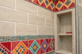 Add a touch of artistry with mosaic tile accents that can transform a simple steam shower into a visual masterpiece. I’ve seen how these intricate designs can become a focal point and elevate the entire bathroom decor.