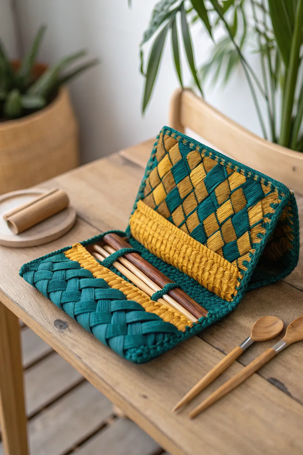 Create a woven pouch for carrying reusable utensils. It’s perfect for those who love outdoor picnics or need a lunch companion.