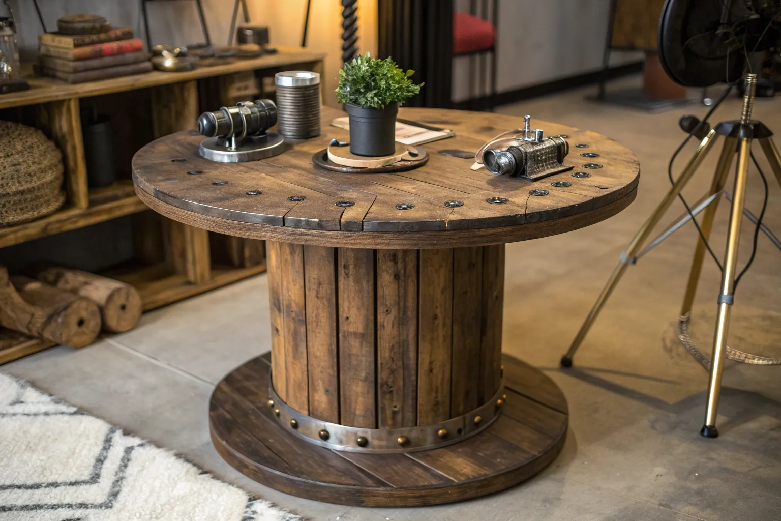 Use the side of a wire spool as a circular shelf by attaching it to the wall. It’s a striking way to display books or plants, and I love how it adds depth to the room.